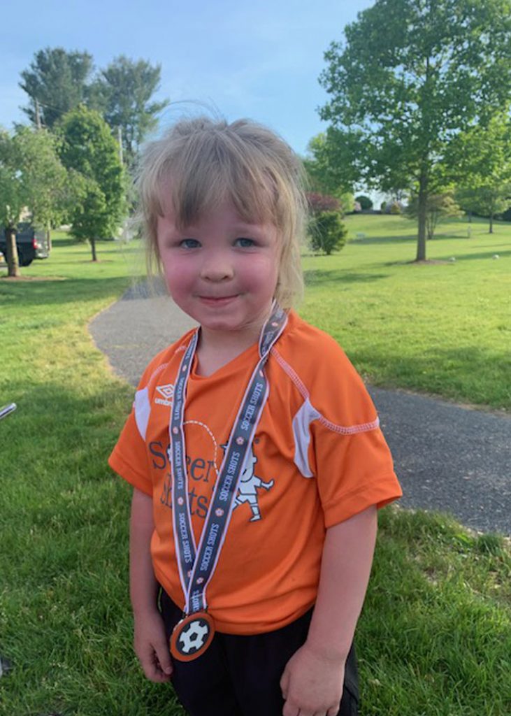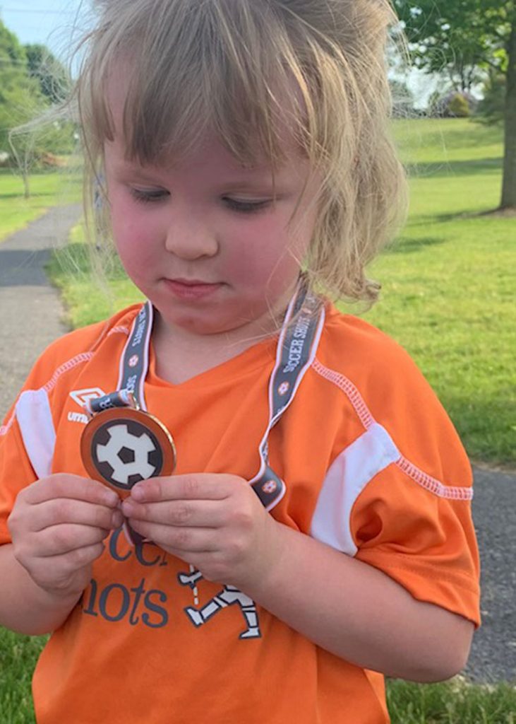 This is my granddaughter, Sophia. She has just completed her first season of soccer shots – a first milestone in being a team member and learning about how to work with others to accomplish a goal. I am so proud of her because I could tell by tonight – her last session – how much she has grown in the skill of kicking and running and being competitive to make a goal. She has a long road ahead to become proficient, but I know she can do it. She was so proud of her necklace and wore it proudly. Our time at the soccer field must come to an end until next fall season. At that time, we will have two granddaughters learning the skill. Olivia will be joining her sister in playing soccer but not in the same session.
